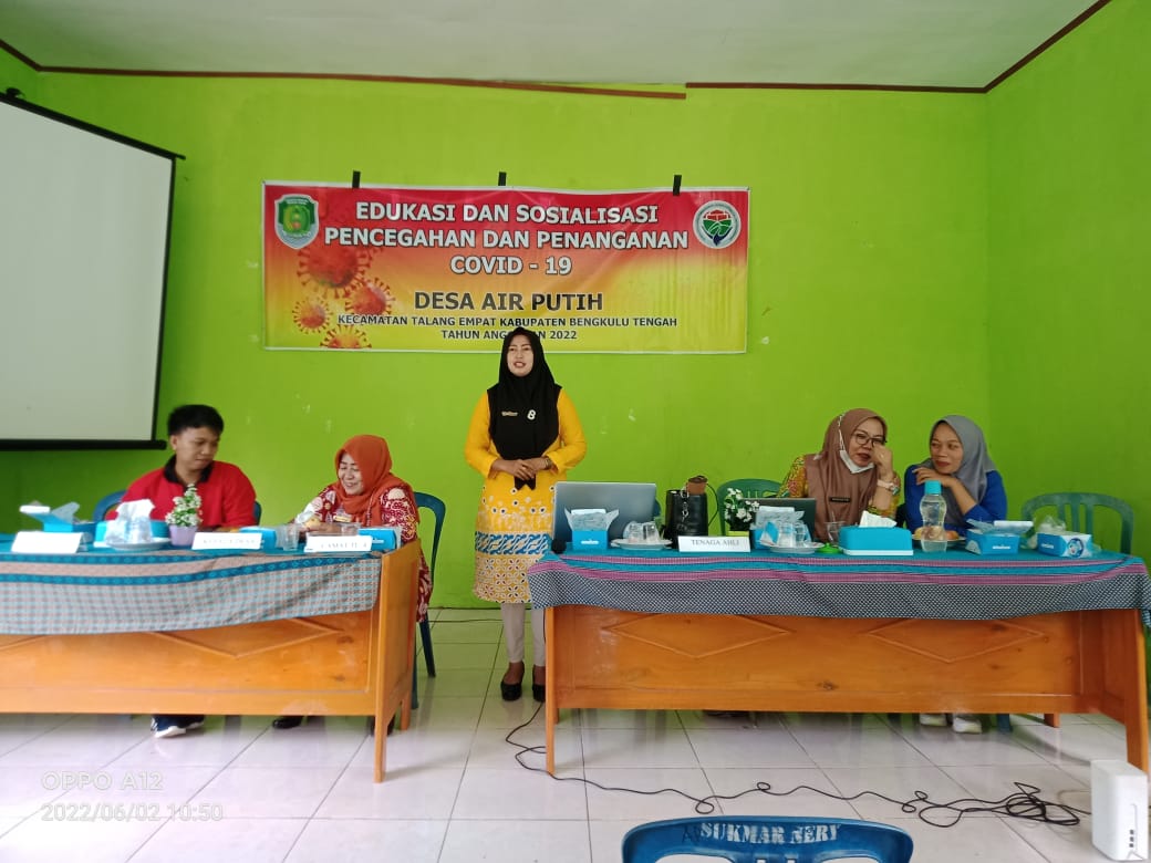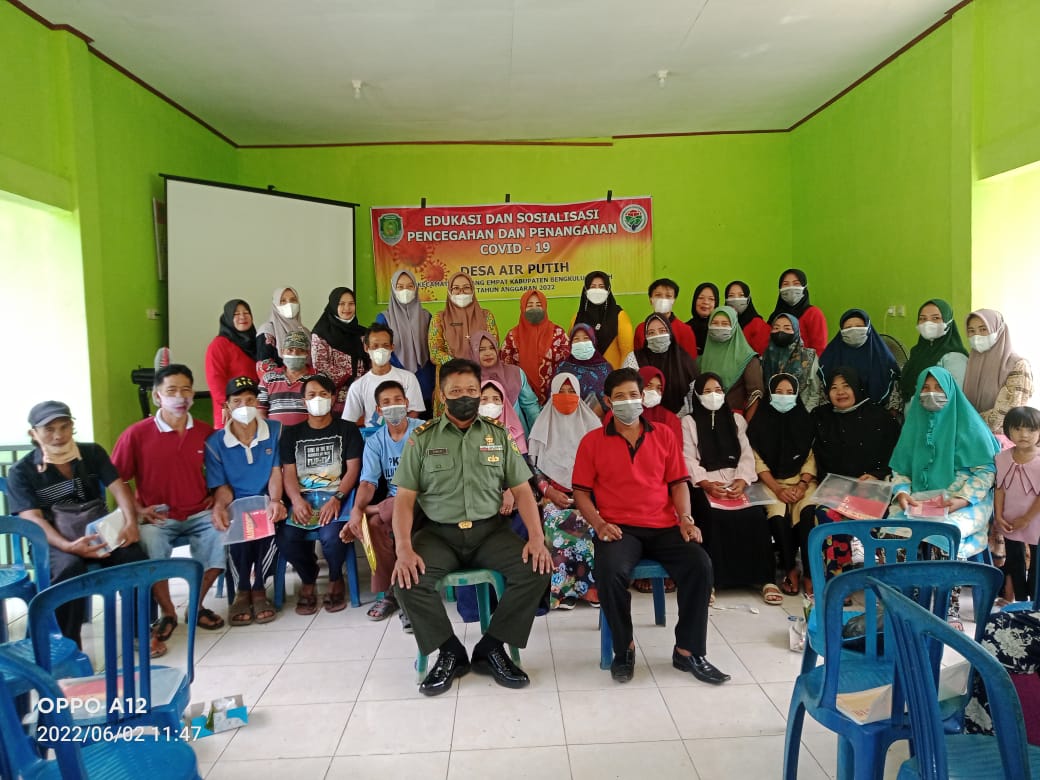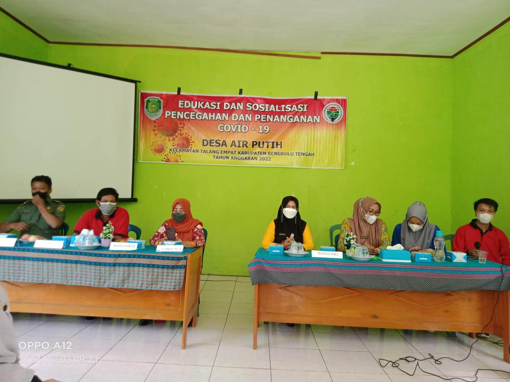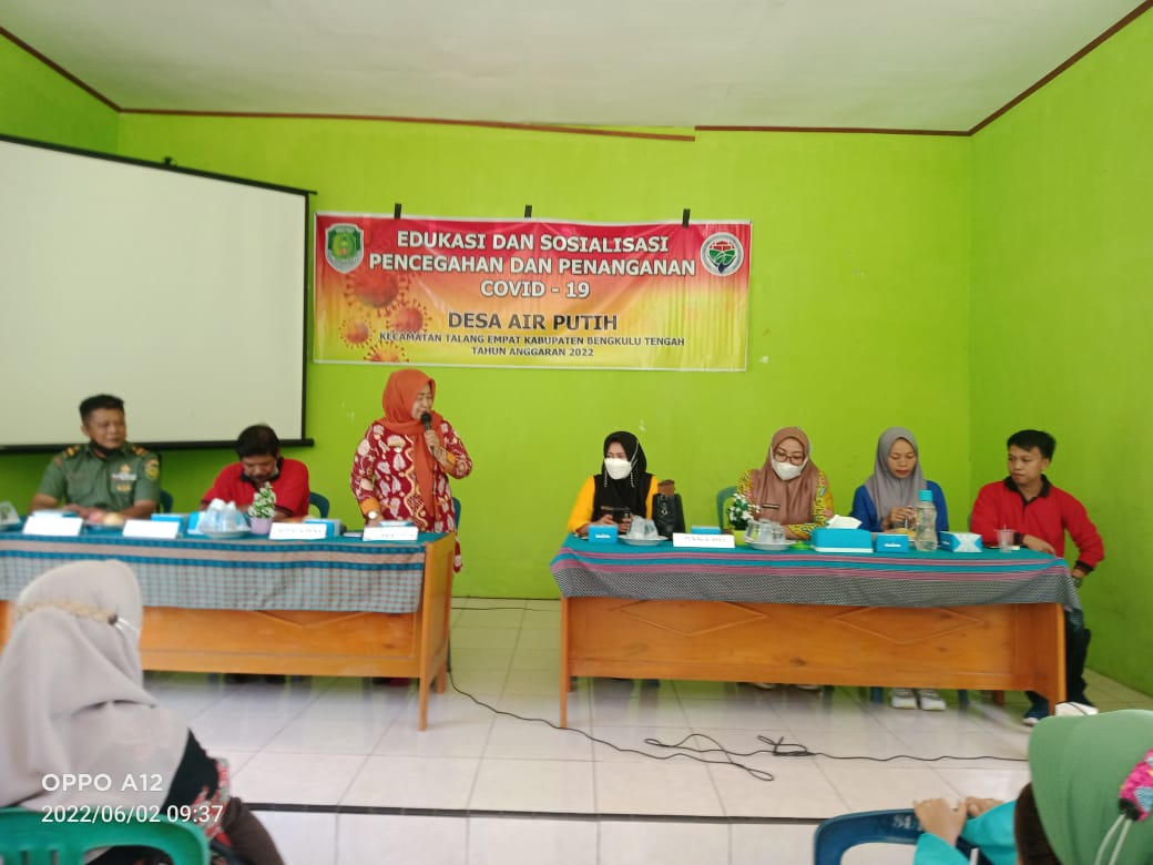 Desa Air Putih adalah salah satu Desa pelayanan masyarakat dan Gugus Tugas Penanganan COVID-19 di Kecamatan Talang Empat Kabupaten Bengkulu Tengah, turut andil dalam upaya pencegahan melalui sosialisasi. Bertempat di Gedung Serbaguna Desa Air Putih pada tanggal 02 Juni 2022 telah diselenggarakan Sosialisasi dan Edukasi Pencegahan Covid-19. Acara yang menghadirkan narasumber dari Dinas Kesehatan Bengkulu Tengah yaitu IDA RIYANI, SST, Kasi promosi Kesehatan dan pemberdayaan Masyarakat, dari Puskesmas Taba Lagan Ibu Herlina pw,SKM , dan Camat Kecamatan talang empat Ibu Hj.SITI FATIMAH. SH . Pertemuan ini dilaksanakan dengan mematuhi protokol covid-19 yaitu pengukuran suhu dan cucitangansebelum masuk ke dalam gedung pertemuan. Acara berlangsung dengan tertib dan para peserta dapat mengikutinya dengan baik. dan Babinsa Pelda Tukiyat turut serta dalam mengawal kegiatan ini